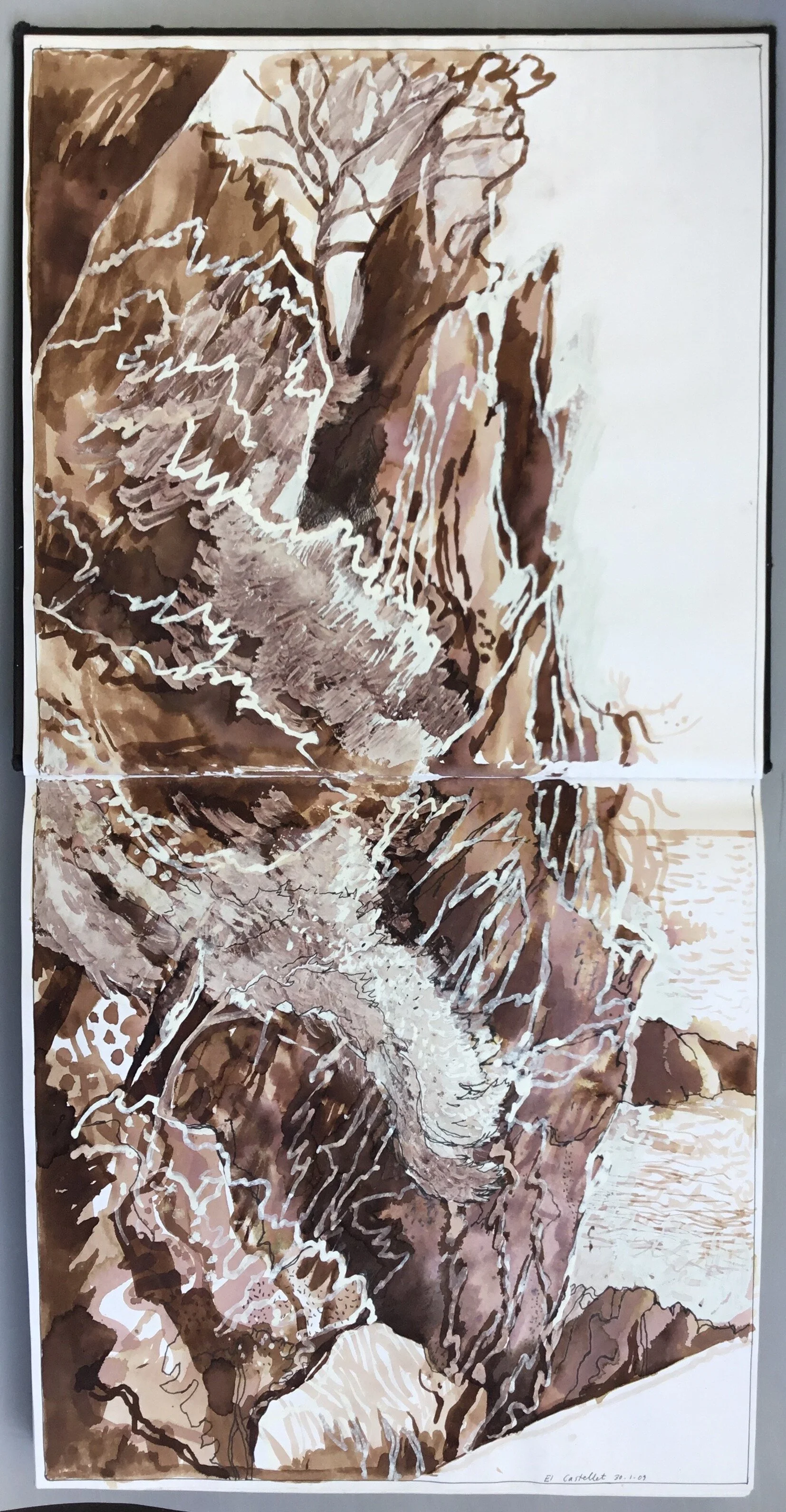 I am half Catalan. It’s a place I know well but not as well as I would like. In 2007 I started to travel around the region more with my sketchbook looking at and working from the landscape. Montserrat, considered to be the spiritual heart of Catalonia had always been a place I wanted to depict in my work. The beautiful Costa Brava was a coastline I was already familiar with. Barcelona had always struck me as a city waiting to be depicted. I had never had the chance. I have been there countless times but never had a concentrated period of time to work from it. There are countless possibilities. This page shows some of the results from my travels so far. My aim is that one day all this energy and effort will focus in a complete body of work ready to be shown in Barcelona.